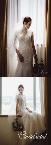 High Neck Cap Sleeves Lace Beaded Mermaid Long Wedding Dresses